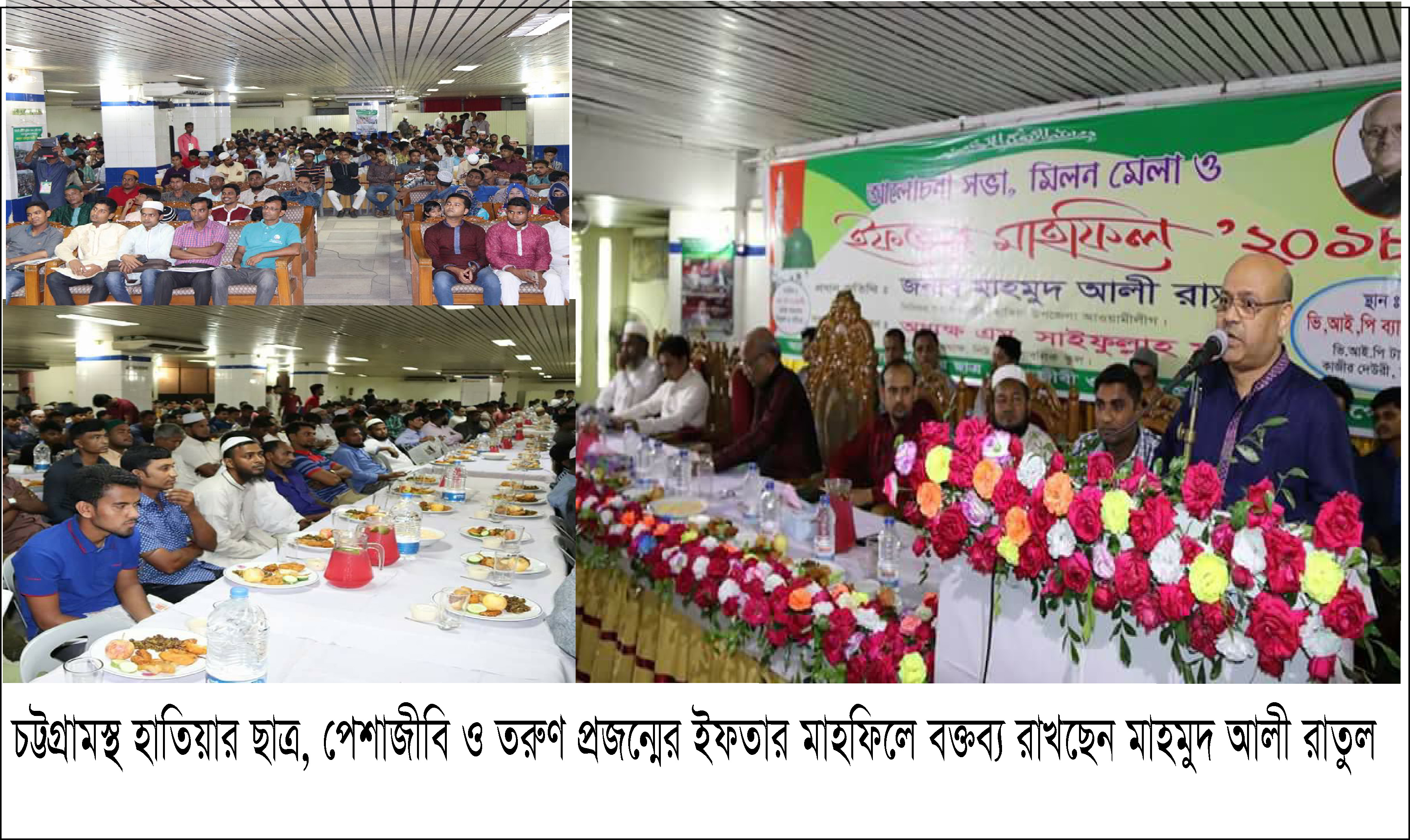 মুহাম্মদ জাকের হোসেন: চট্টগ্রামে বসবাসরত হাতিয়ার ছাত্র, পেশাজীবি ও তরুণ প্রজন্মের উদ্যোগে আয়োজিত আলোচনা সভা, মিলনমেলা ও ইফতার মাহফিল গতকাল ২৫ মে ২০১৮ তারিখে চট্টগ্রাম কাজীর দেউরী ভি.আই.পি. ব্যাংকোয়িট এ পবিত্র কোরআন তেলোয়াতের মাধ্যমে অনুষ্ঠিত হয়। অধ্যক্ষ জনাব সাইফুল্লাহ মুনির এর সভাপতিত্বে এতে প্রধান অতিথি হিসেবে উপস্থিত ছিলেন হাতিয়া উপজেলা আওয়ামীলীগের সহ-সভাপতি জনাব মাহমুদ আলী রাতুল। প্রধান আলোচক হিসেবে উপস্থিত ছিলেন চট্টগ্রাম বিশ্ববিদ্যালয়ের কলা ও মানববিদ্যা অনুষদের সাবেক ডীন অধ্যক্ষ ড.মোহাম্মদ হায়াত হোসেন। আরও উপস্থিত ছিলেন চট্টগ্রামস্থ হাতিয়া জনকল্যাণ সমিতির সাধারণ সম্পাদক খলিলুল্লাহ চৌধুরী সাকিব সহ চট্টগ্রামের বসবাসরত হাতিয়ার বিভিন্ন গুণিজন। শুভেচ্ছা বক্তব্য রাখেন মুহাম্মদ জাকের হোসেন ও মোঃ আশরাফ, তুষার সম্পদ, মাকসুদ ও মোঃ তসলিম সিকদার। জনাব মাহমুদ আলী রাতুল তার বক্তব্যে মাহে রমজানের পবিত্রতার উপর বিশেষ গুরুত্ব দেন এবং তিনি হাতিয়া বাসীর চলমান সমস্যা সমাধানের জন্য সকলকে ঐক্যবদ্ধভাবে কাজ করতে আহŸান জানান। এসময় তিনি হাতিয়ার সকল সমস্যা ও তার সমাধান কিভাবে সম্ভব তা সু স্পষ্ট ভাবে তার বক্তব্যে তুলে ধরেন এবং সকলকেই সুষ্ঠু ধারার রাজনীতি চর্চার জন্য উৎসাহিত করেন।