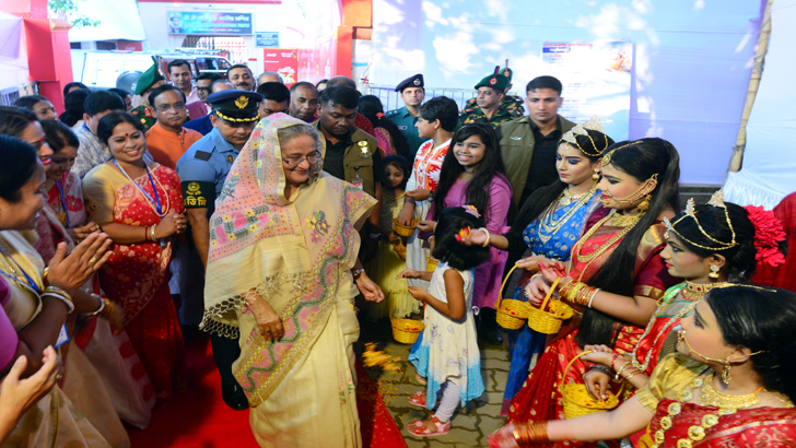 এর আগে প্রধানমন্ত্রী রামকৃষ্ণ মিশন পূজামণ্ডপ পরিদর্শনে যান। সেখানে মিশনের অধ্যক্ষ স্বামী ধ্রুবেশানন্দ প্রধানমন্ত্রীকে ফুল দিয়ে স্বাগত জানান। স্থানীয় এমপি কাজী ফিরোজ রশিদ এবং পুলিশের আইজি ড. মোহাম্মদ জাভেদ পাটোয়ারি এ সময় অন্যান্যের মধ্যে বক্তব্য রাখেন।