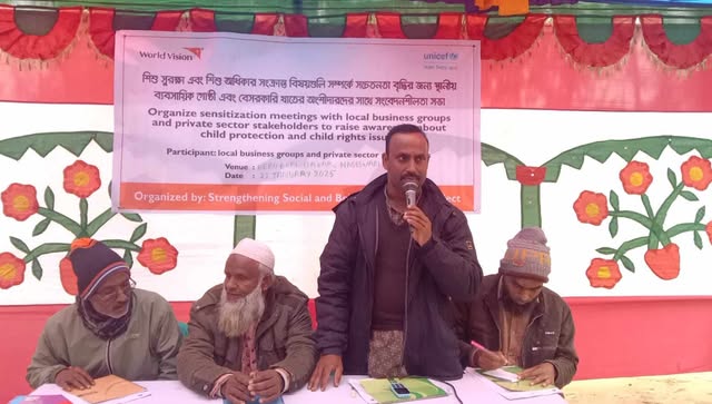 ২২ জানুয়ারী ২০২৫ইং বুধবার সকাল ১১ ঘটিকায় বেরুবাড়ী বাজার প্রাঙ্গনে ওয়ার্ল্ড ভিশন বাংলাদেশের এসএসবিসি প্রকল্পের স্ট্রেনদেনিং সোশ্যাল এন্ড বিহেভিয়ার চেঞ্জ প্রকল্পের আয়োজনে ও ইউনিসেফের অর্থায়নে এ সভা অনুষ্ঠিত হয়। বেরুবাড়ী ইউনিয়নের ১নং ওয়ার্ডের ইউপি সদস্য আশরাফুল ইসলাম এর সভাপতিত্বে প্রধান অতিথি হিসেবে বক্তব্য রাখেন- ডাঃ মোঃ নূরুল ইসলাম, বিশেষ অতিথি হিসেবে বক্তব্য রাখেন- বিশিষ্ট ব্যবসায়ী মোঃ আক্কাছ আলী সহ আরো অনেকে।
