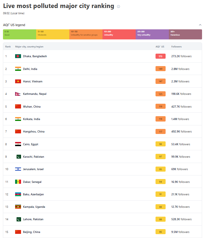 আন্তর্জাতিক বায়ুমান প্রযুক্তি প্রতিষ্ঠান আইকিউএয়ারের তথ্যানুযায়ী, শনিবার সকাল ৯টায় ঢাকার স্কোর ১৭৩, যা জনস্বাস্থ্যের জন্য ‘অস্বাস্থ্যকর’ হিসেবে বিবেচিত।