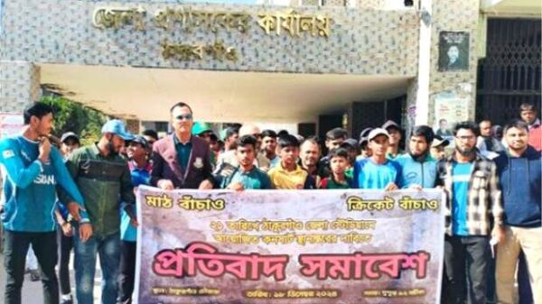 ঠাকুরগাঁও জেলা প্রতিনিধি: “মাঠ বাঁচাও, ক্রিকেট বাঁচাও” এই স্লোগানে মানববন্ধন ও প্রতিবাদ সমাবেশ করেছে ঠাকুরগাঁওয়ের খেলোয়াড়রা। গত ১৮ ডিসেম্বর বুধবার দুপুরে শহরের চৌরাস্তায় ঠাকুরগাঁও জেলার সকল ক্রিকেট খেলোয়াড় ও ক্রিকেটের সাথে