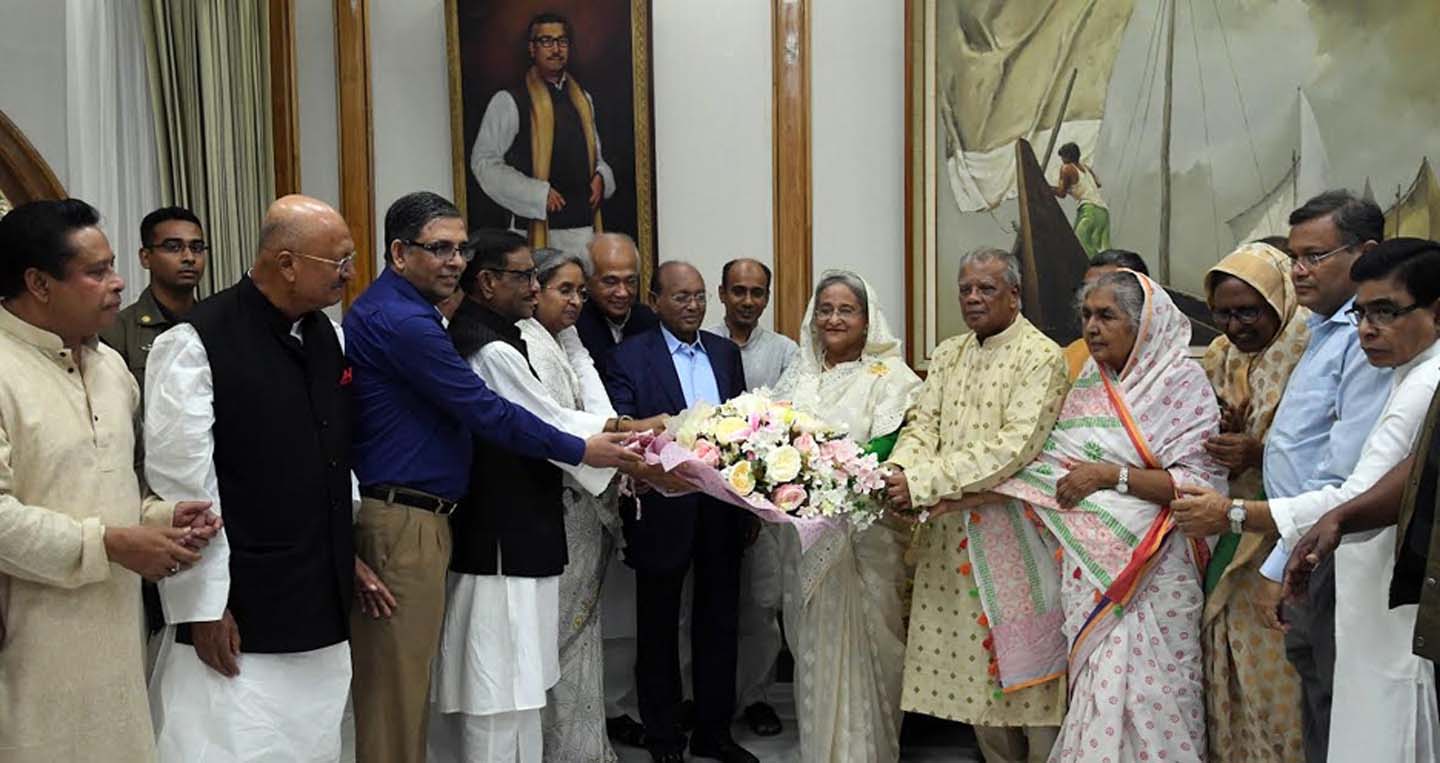 প্রধানমন্ত্রী শেখ হাসিনার কারামুক্তি দিবস উপলক্ষে মঙ্গলবার গণভবনে বাংলাদেশ আওয়ামী লীগ ও এর অঙ্গসংগঠনের নেতৃবৃন্দ তাঁকে ফুল দিয়ে শুভেচ্ছা জানান। -পিএম জীবন
