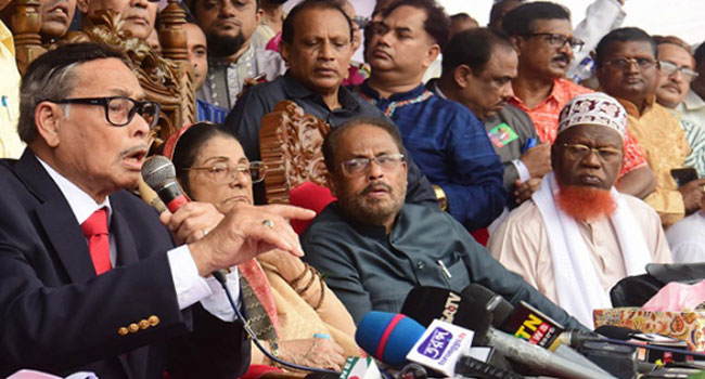 জাতীয় পার্টির চেয়ারম্যান হুসেইন মুহম্মদ এরশাদ বলেছেন, বর্তমান সংবিধান অনুযায়ী জাতীয় ঐক্যফ্রন্টের সাত দফা দাবি মেনে নেওয়া সম্ভব নয়। বর্তমান সংসদে প্রতিনিধিত্বকারী দল নিয়ে নির্বাচনকালীন সরকার গঠন করতে হবে। আজ