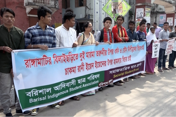 রাঙ্গামাটির বিলাইছড়িতে মারমা তরুণী ধর্ষণ ও রানীর ওপর হামলার প্রতিবাদে এবং ধর্ষক ও হামলাকারীদের দৃষ্টান্তমূলক শাস্তির দাবিতে বরিশালে মানববন্ধন অনুষ্ঠিত হয়েছে। আদিবাসী ছাত্র পরিষদ ও সমাজতান্ত্রিক ছাত্র ফ্রন্টের উদ্যোগে শুক্রবার