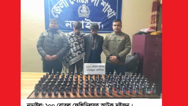 নড়াইল জেলা প্রতিনিধি: নড়াইল সদর উপজেলায় ১০০ বোতল ফেনসিডিল সহ শাহাবুদ্দিন ইসলাম (৩১) ও আলমিরাজ (১৯) নামে দুই মাদক কারবারিকে জেলা গোয়েন্দা পুলিশ আটক করেছে। শুক্রবার (১০জানুয়ারি) রাতে সদর উপজেলার