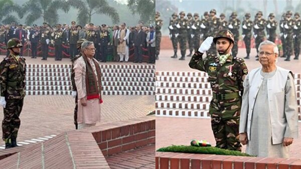 অনলাইন ডেস্ক: মহান বিজয় দিবসে জাতীয় স্মৃতিসৌধে বীর শহীদদের প্রতি শ্রদ্ধা জানিয়েছেন প্রধান উপদেষ্টা ড. মুহাম্মদ ইউনূস ও রাষ্ট্রপতি মো. সাহাবুদ্দিন। আজ মঙ্গলবার (১৬ ডিসেম্বর) জাতীয় স্মৃতিসৌধে প্রথমে সকাল ৬টা ৩৩
