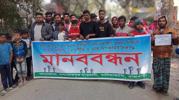 জেলা প্রতিনিধি:রাজবাড়ীর বালিয়াকান্দিতে প্রাথমিক বিদ্যালয়ের প্রধান শিক্ষকের বিভিন্ন দুর্ণীতি ও অসামাজিক কার্যকলাপের প্রতিবাদে অপসারণ দাবীতে মানববন্ধন করেছে শিক্ষার্থী ও অভিভাবক ও এলাকাবাসী। রবিবার সকালে ঘন্টাব্যাপী বালিয়াকান্দি উপজেলার অলংকারপুর সরকারী প্রাথমিক
